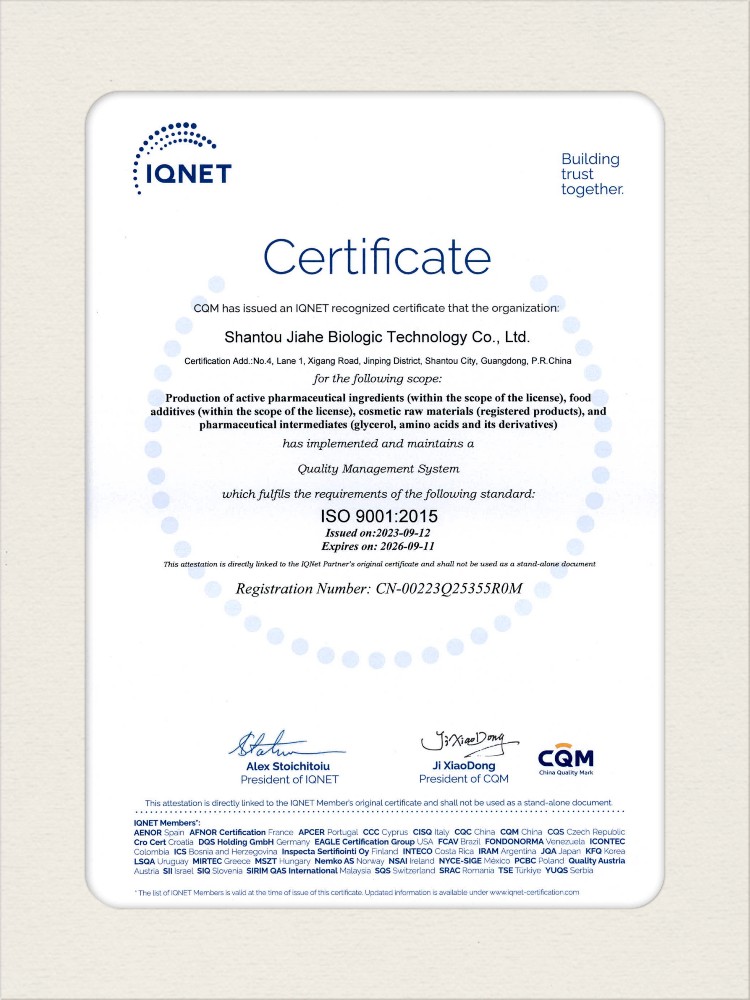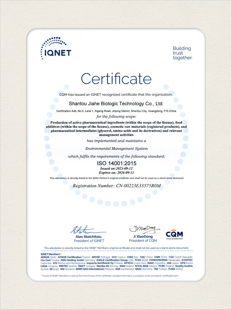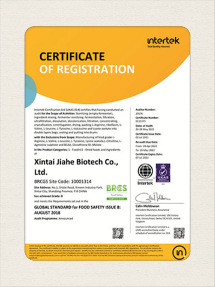 汕頭佳禾生物科技有限公司是一家致力于氨基酸及其衍生物研發(fā)、生產(chǎn)和銷售的國(guó)家高新技術(shù)企業(yè),先后通過(guò)了國(guó)家藥品GMP認(rèn)證,ISO9001質(zhì)量體系認(rèn)證、ISO14001環(huán)境管理體系認(rèn)證。目前,公司擁有“廣東省專精特新中小企業(yè)”、“廣東省氨基酸產(chǎn)品工程技術(shù)研究中心”、“汕頭市生物發(fā)酵工程技術(shù)研究開(kāi)發(fā)中心”、“汕頭市知識(shí)產(chǎn)權(quán)優(yōu)勢(shì)企業(yè)”、“多項(xiàng)國(guó)家發(fā)明專利”、“廣東省守合同重信用企業(yè)”等多項(xiàng)資質(zhì)和榮譽(yù),旗下“佳禾牌”系列產(chǎn)品已成為原料藥行業(yè)知名品牌。 新泰市佳禾生物科技有限公司成立于2012年8月,注冊(cè)資金2億元,公司位于山東泰安新泰市新汶工業(yè)園區(qū),是國(guó) 家級(jí)高新技術(shù)企業(yè)、山東省“專精特新”企業(yè)、山東省制造業(yè)單項(xiàng)冠軍企業(yè)、泰安市科技型中小企業(yè)、泰安市農(nóng)業(yè)產(chǎn)業(yè)化龍頭企業(yè)、中國(guó)生物發(fā)酵產(chǎn)業(yè)協(xié)會(huì)理事單位。